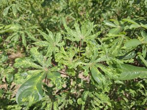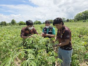 วันที่ 18 มิถุนายน 2568 นายประเสริฐ อินเกตุสมบูรณ์ ผู้อำนวยการศูนย์ส่งเสริมเทคโนโลยีการเกษตรด้านอารักขาพืช จังหวัดพิษณุโลก มอบหมายให้ นายโยธี เปล่งขำ นักวิชาการส่งเสริมการเกษตรชำนาญการ ร่วมกับเจ้าหน้าที่สำนักงานเกษตรจังหวัดอุทัยธานี และสำนักงานเกษตรอำเภอห้วยคต จังหวัดอุทัยธานี ติดตามผลการดำเนินงานโครงการส่งเสริมการจัดการสุขภาพพืชเพื่อเพิ่มประสิทธิภาพการผลิตสินค้าเกษตร และสำรวจแปลงมันสำปะหลัง พันธุ์ KU50 อายุ 4 เดือน ในพื้นที่อำเภอห้วยคต จังหวัดอุทัยธานี พบการระบาดของโรคใบด่างมันสำปะหลังกระจายทั่วแปลง และแมลงหวี่ขาวเล็กน้อย จึงได้สนับสนุนแมลงช้างปีกใส จำนวน 300 ตัว และไข่แมลงช้างปีกใส จำนวน 1,000 ฟอง ให้กับเกษตรกร พร้อมทั้งแนะนำ ให้เกษตรกรหมั่นสำรวจแปลงและเฝ้าระวังอย่างสม่ำเสมอต่อไป